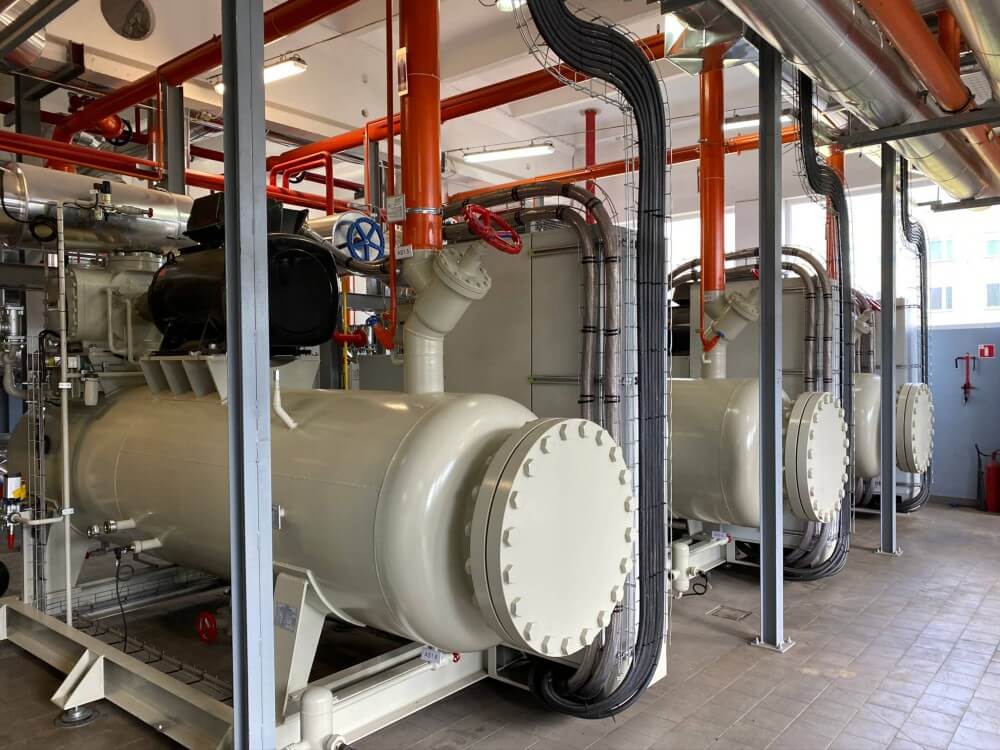 Instalacja amoniakalna w SM Mlekpol ZPM Mrągowo swoje działanie opiera o 4 agregaty sprężarkowe produkcji J.S.Cooling o łącznej mocy chłodniczej prawie 7000 kW.