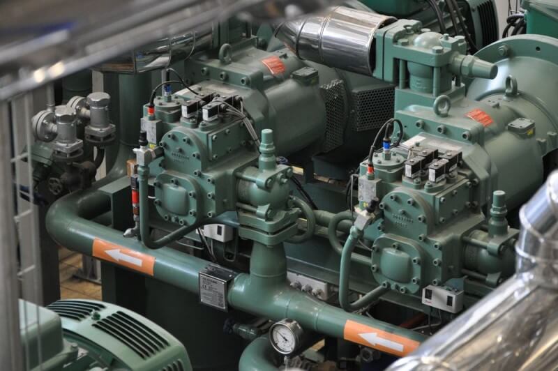 - Nasze agregaty wyposażamy w nowoczesne energooszczędne silniki elektryczne, które znacznie obniżają zużycie energii przez agregat, a dodatkowo przyśpieszają zwrot inwestycji. Do sprężania pary amoniaku wybieramy tylko sprężarki śrubowe o wysokim współczynniku COP, który mówi o dużej ilości wyprodukowanego chodu z jednej kWh.