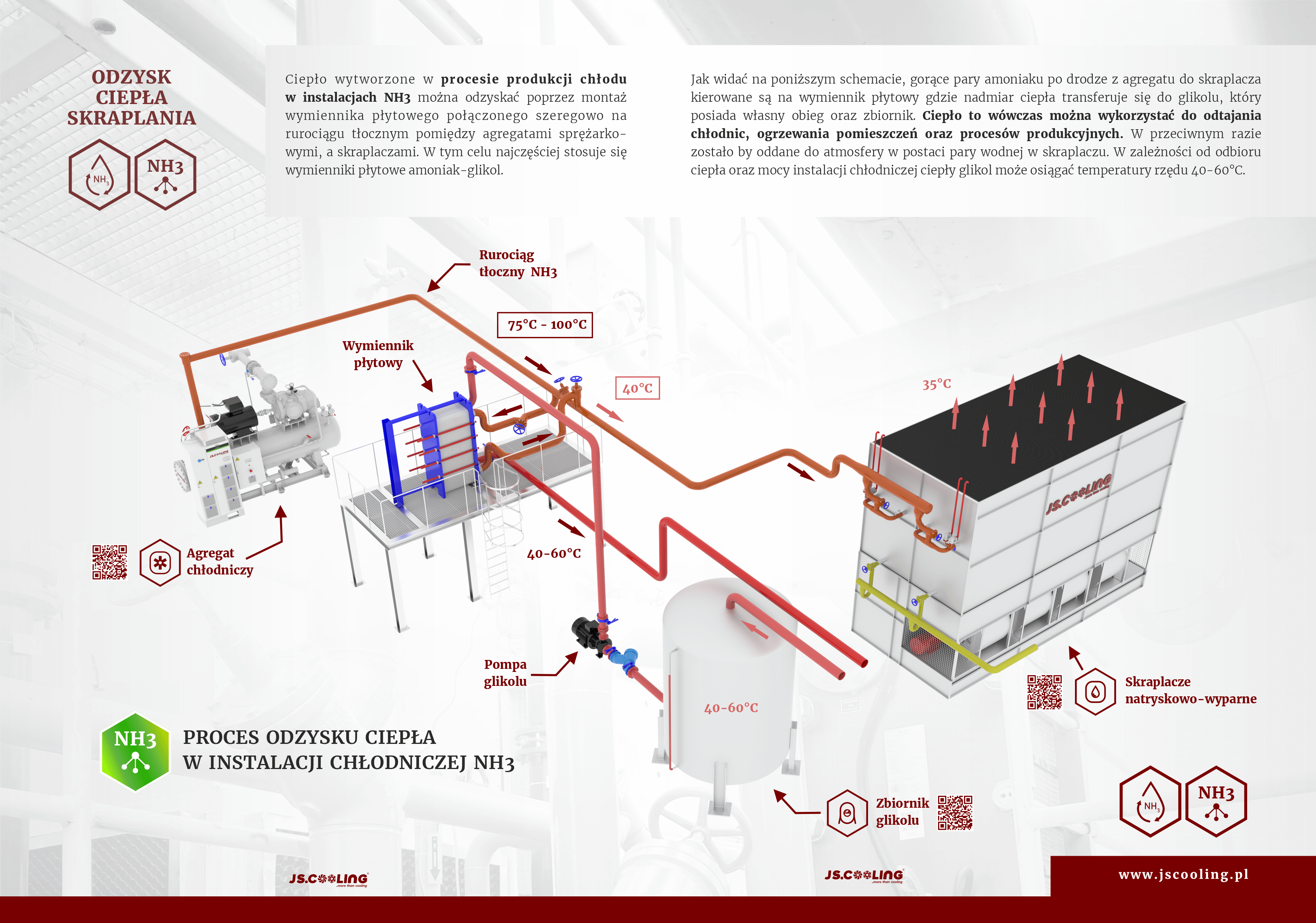 Jak widać na powyższym schemacie, gorące pary amoniaku po drodze z agregatu do skraplacza kierowane są na wymiennik płytowy gdzie nadmiar ciepła transferuje się do glikolu, który posiada własny obieg oraz zbiornik. Ciepło to wówczas można wykorzystać do odtajania chłodnic, ogrzewania pomieszczeń oraz procesów produkcyjnych. W przeciwnym razie zostało by oddane do atmosfery w postaci pary wodnej w skraplaczu. W zależności od odbioru ciepła oraz mocy instalacji chłodniczej ciepły glikol może osiągać temperatury rzędu 40-60°C.