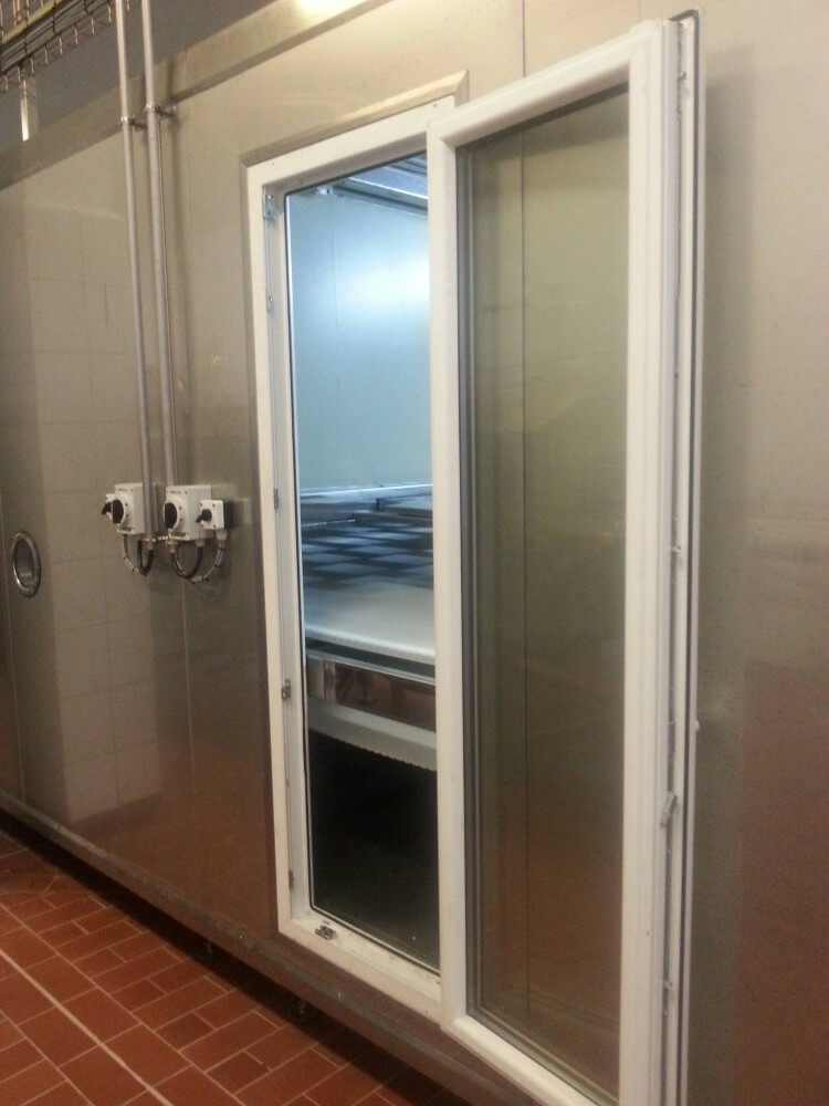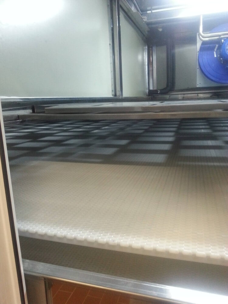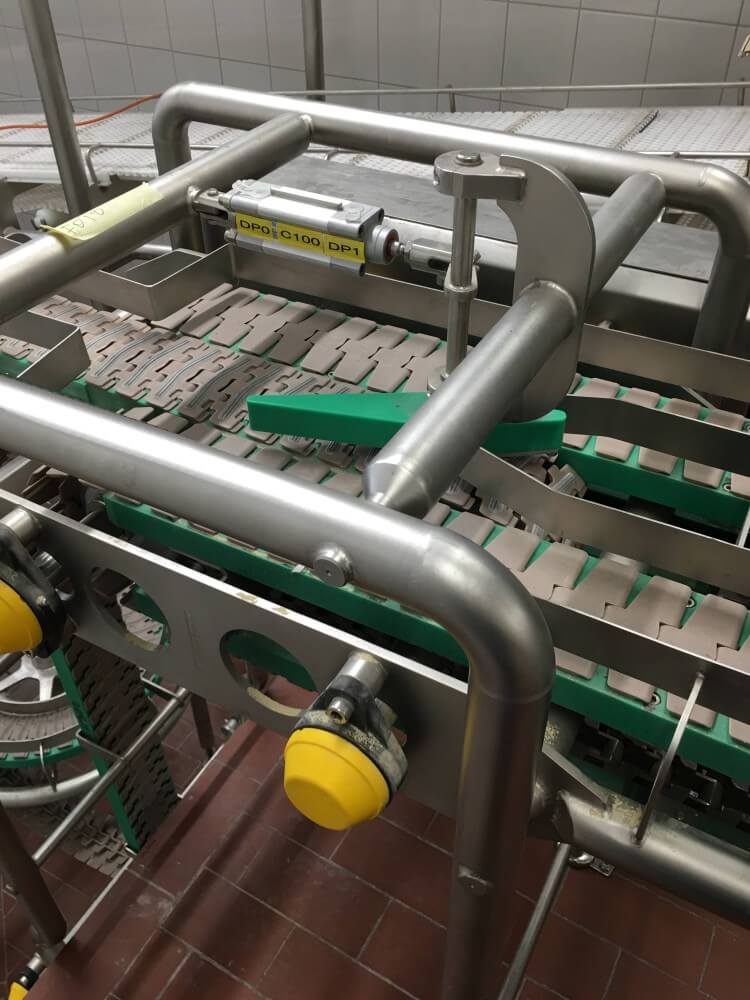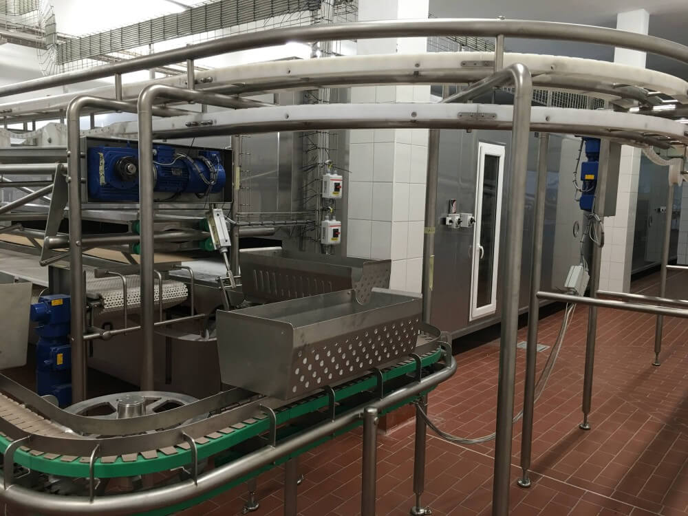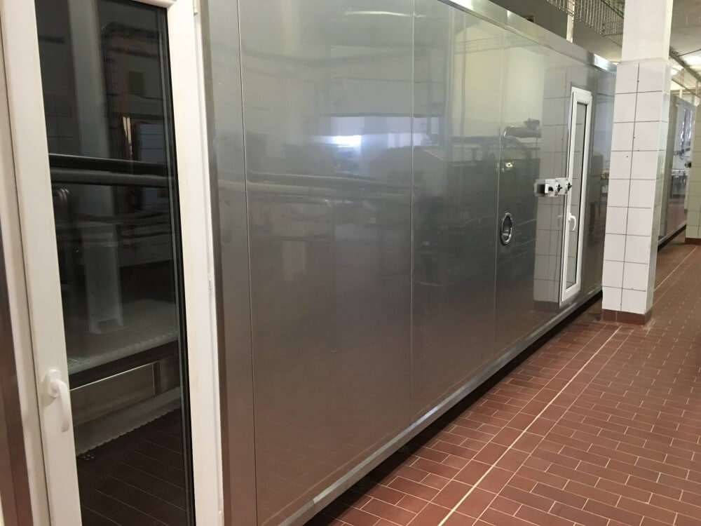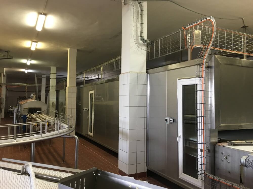 Tunel przelotowy w SM Mlekpol ZPM Zambrów składa się m.in. z obudowy modułowej, wentylatorów nadmuchujących, taśmy transportowej oraz systemu załadunku i rozładunku produktu.